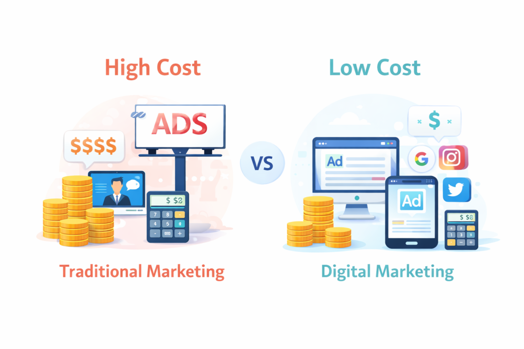 Traditional marketing through TV commercials, hoardings, and print ads can prove to be costly. It may not be feasible for small businesses to adopt such a strategy. It is here that digital marketing plays its role.